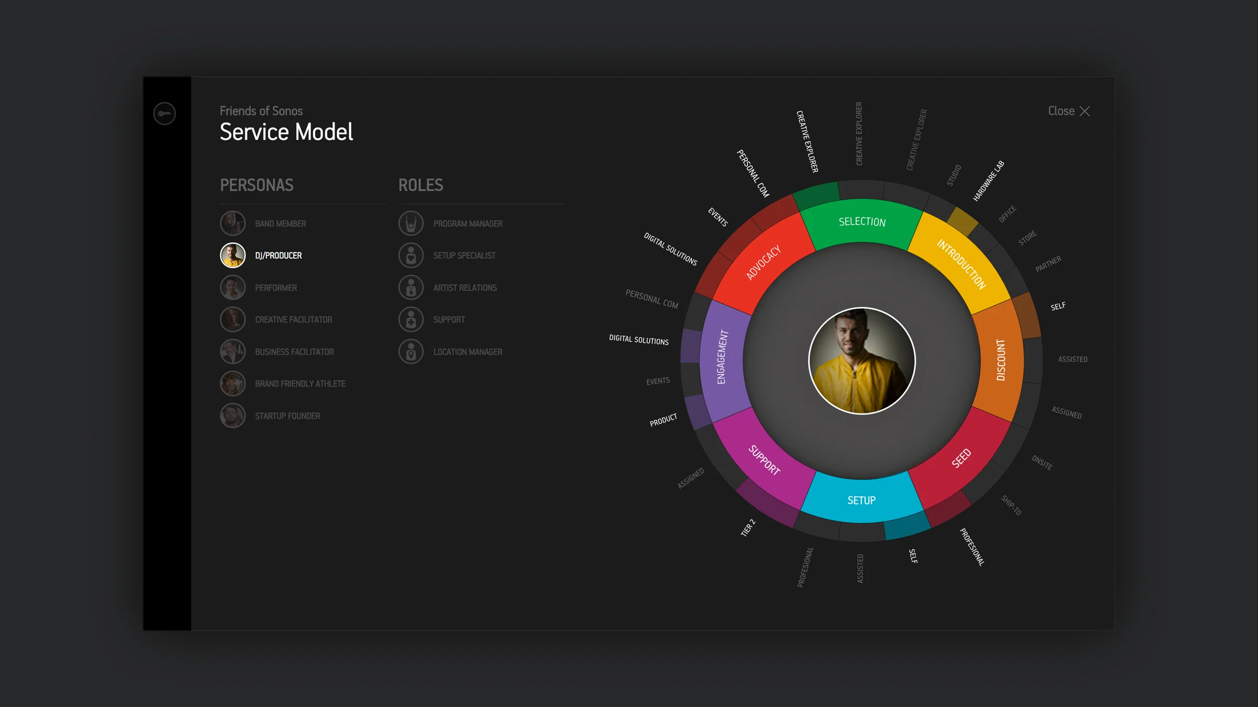 As a true service design experience, we mapped out the intricate interplay between people, systems, and locations from numerous deep interviews and working sessions with creators and artist relations agents. The goal was to ensure that creators’ needs were being met in the journey to discover and explore the power of the Sonos products.